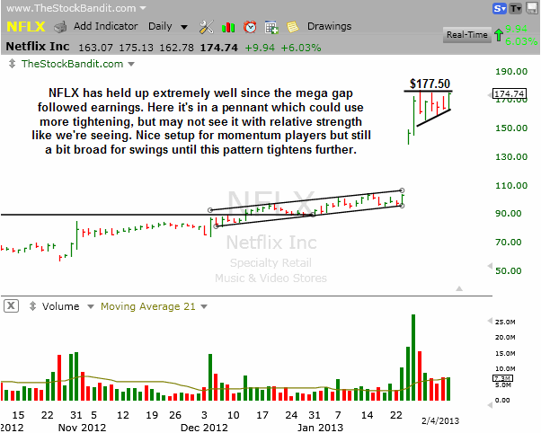 NFLX was oblivious to the widespread market weakness today, especially that found in the Nasdaq, and instead tacked on 6%. This stock has been working on a rather wide pennant pattern since it cooled off post-earnings, but a print above $177.50 and it’s back on the move for momentum traders.