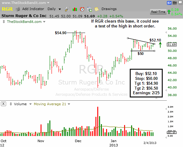 RGR has based for the past couple of weeks after the December pullback tested the early-November low in the $40 area. A turn up from this base at $52.10 and I’ll get long looking for at least a test of the high, and possibly more. Earnings are due out in 3 weeks.