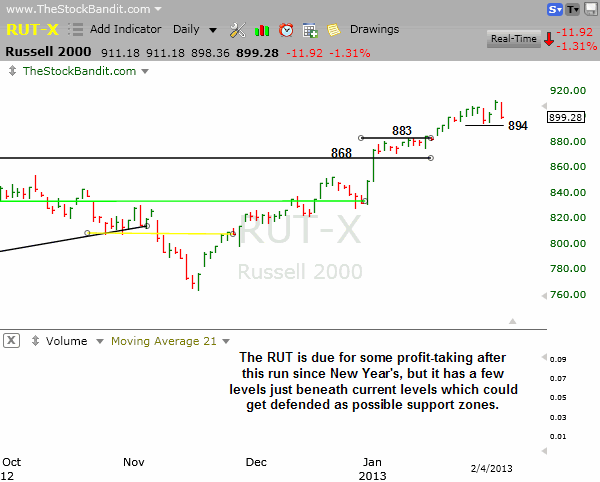 RUT – The RUT put up its worst day today since Nov. 14th, two sessions before the big turn took place. This index certainly has the room to correct after such a big run, and I’m watching 894, 883, and 868 as levels of potential support if this dip continues.