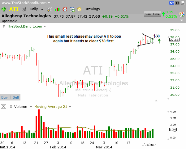 ATI is also sitting in a pennant here and a push above $38 could set it free for higher prices once again. This would only be a single-day play for me, as the next pop is all I’m interested in.