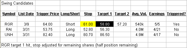 With the NAZ bounce looking less convincing than that of the S&P 500 (due to its ability to hold the 1850 range boundary of late), we’ve still got a mixed market. I’m therefore considering plays on both sides and simply trying to stick with the best setups I can find. I’m down to a half position in my lone swing trade RGR after it reached Target 1 today, and have aggressively tightened my stop for remaining shares using the support level it just broke last week. For tomorrow, there are a handful of cashflow/single-day plays along with a pair of new swing candidates which have a little time before earnings are due out.