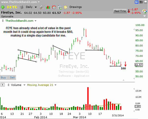 FEYE is oversold on the basis of lost ground in the past few weeks, but in the short-term it has put in some low-level rest and could crack again. I like it for a single-day play on the short side for Tuesday if it undercuts $60 with room to fall toward the mid-January support near $55.