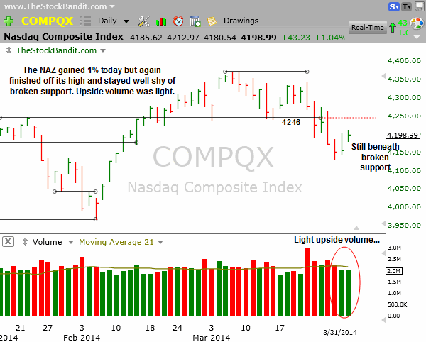 Those tiny net changes just go to show how little lasting follow through we’ve seen, and we’ll kick off Q2 right near the starting line for 2014. It’s been one reversal after another regardless of which timeframe you’re watching. It all has added up to a minor net change overall. There have no doubt been many who have tried to leverage up this year after a solid performance by the broad market in 2013 only to grow frustrated with the lack of overall movement. It’s one more example of why it’s so important to continually stay attentive to the character of the price action rather than predict what’s going to happen next.