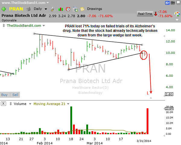 PRAN had one of those moves today that nobody could have seen coming. However, it’s noteworthy that it had already technically broken down from its large wedge pattern last week. Biotechs are high-risk for a reason, and this type of move is just one reason I’m so careful when considering any overnight play in this group.