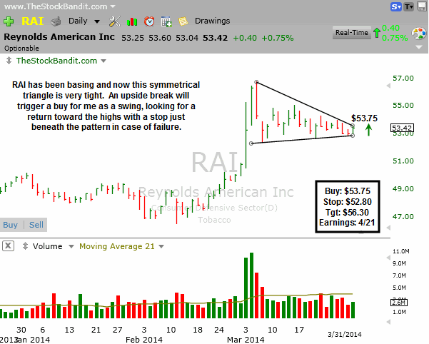 RAI is in a tight wedge or symmetrical triangle here and I like the risk/reward for a swing. I’ll get long if price can clear $53.75 to break the upper trend line, and I’ll look for a rally back toward the high with a stop beneath the base. Earnings are three weeks out, so I’ll look to tighten my stop aggressively if this one starts to get going and will be completely out prior to the announcement.