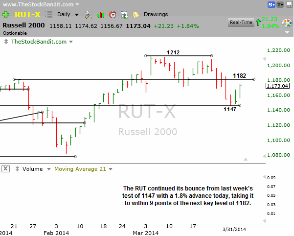 RUT – The RUT couldn’t hold onto gains on Friday but today it sure did, ending just 1 point off the session high and only 9 points from the 1182 level it broke last week. That’s the next big level on the way back up.