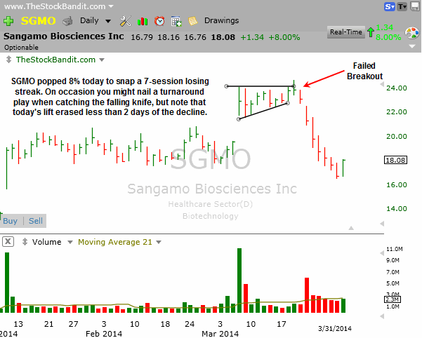 SGMO bounced back today but gives us a good example chart to discuss. Traders love to fade streaks, but being just a little bit early can prove quite costly. Today’s bounce recovered less than 2 days of the 7-day decline, reminding us that it’s never a bad thing to wait for some strength before considering a buy on weakness.