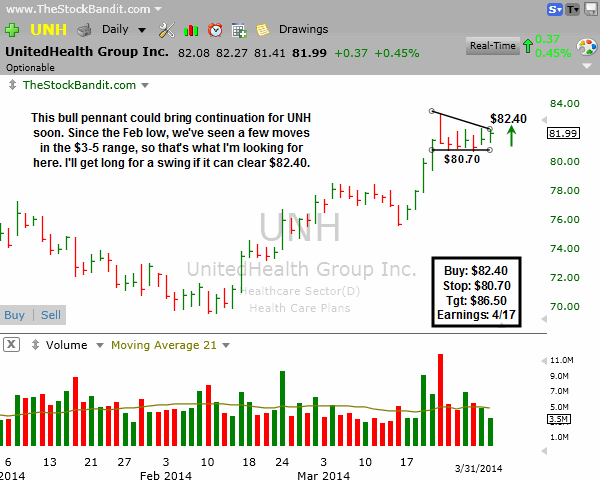 UNH has earnings due out April 17th, so there’s not a lot of time for it. However, it has had a few quick rallies since the February low of $3-5, so I’m willing to give it a shot. I’ll look to get long through $82.40 with a stop beneath the base, looking for a similar-sized move to the prior lifts. Here again, I’ll aggressively tighten my stop due to earnings approaching, and will be out prior to the announcement.