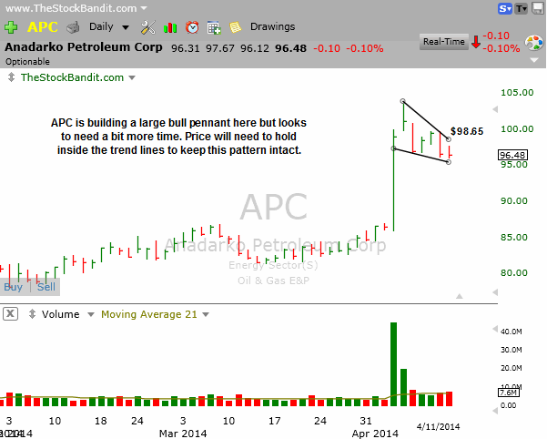 APC is still constructing a bull pennant here as it pulls back in an orderly fashion (so far) from its recent high. This stock hasn’t undergone a negative change of character, but I’m just going to keep it on watch until price can pressure the upper trend line of the pennant. Tonight it’s hovering near the lower portion of the pennant, so I’m not setting up a play yet.