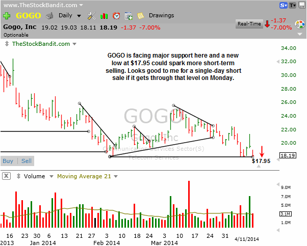 GOGO has returned to major support and looks vulnerable to a breakdown soon. A new low at $17.95 on Monday and I’ll take it for a single-day play on the short side. Like the others listed above, this just isn’t a swing-type of setup despite the importance of the support level because the base itself (and therefore a swing stop) is just too wide and loose. So I’ll opt to participate in the initial move and return to the sidelines before the closing bell.