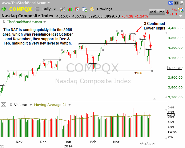 NAZ – The NAZ now has 3 confirmed lower highs since topping in March, and now it’s coming into a major level of 3966. We’ve seen a couple of triple-digit declines here though, which is to say it’s an emotional tape and not necessarily one which will show respect for key levels. The outlier factor is that it’s short-term stretched on the downside as it comes into this key area, which may allow for a bounce. It’s an emotional tape, however, so despite 3966 being a verified level on both sides in recent months, there’s no guarantee we hold it if it’s reached. The key is to stay attentive to the price action and not to count on lasting upside until ample stabilization has arrived.