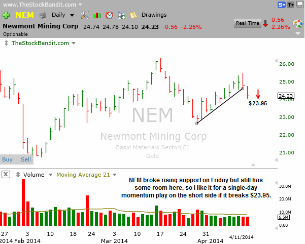 NEM broke rising support on Friday but still has room to continue lower here. I like it for a single-day play on the short side if it makes a new low at $23.95 to show some continuation.