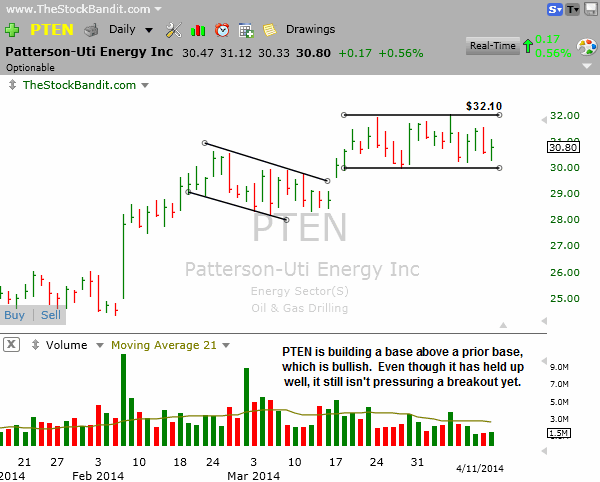 PTEN is holding up nicely within this multi-week channel above the prior base. That’s bullish, but until price pressures the upper trend line to threaten a breakout, I don’t see a play. This is another one on my radar but I have no play set up yet since price is sitting in the center of the channel and appears to need more time.