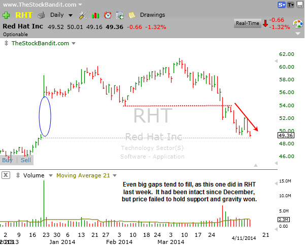 RHT had a big gap higher last December, but it eventually got filled. Just 3 weeks ago we saw a new low established, a bounce back to test that zone from below, and a failure. Since then, prices worked lower to fill the gap. Even big gaps frequently fill, they just sometimes take considerable time to do so.