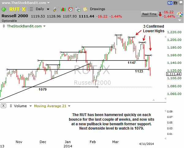 RUT – The RUT is getting hit hard here and also has 3 confirmed lower highs in place. Next potential area of support is 1079, and at the pace it’s moving, that’s not too far away. Right now we’re seeing the opposite mindset of dip-buying, which is that higher prices are being used to raise cash repeatedly.