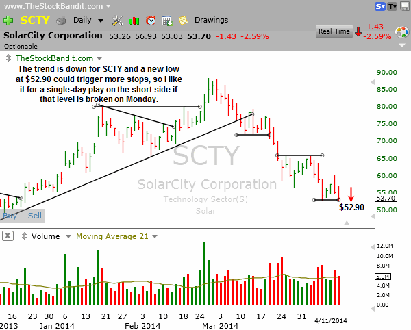 SCTY is at short-term support here and a new low at $52.90 could easily trigger more sell stops. The trend is down here and looks likely to continue, so I like it for a single-day play on the short side if that level gets broken on Monday.