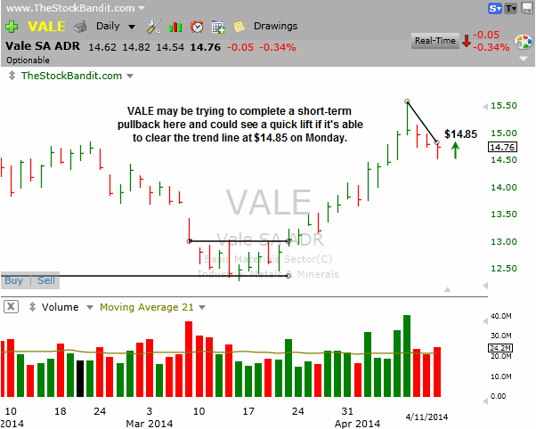 VALE is possibly completing a short-term dip here as evidenced by the lift from the low on Friday to finish only 5c lower on the session. A push north of the trend line at $14.85 on Monday would trigger a single-day play for me on the long side but just for a single-day move back toward the recent high.