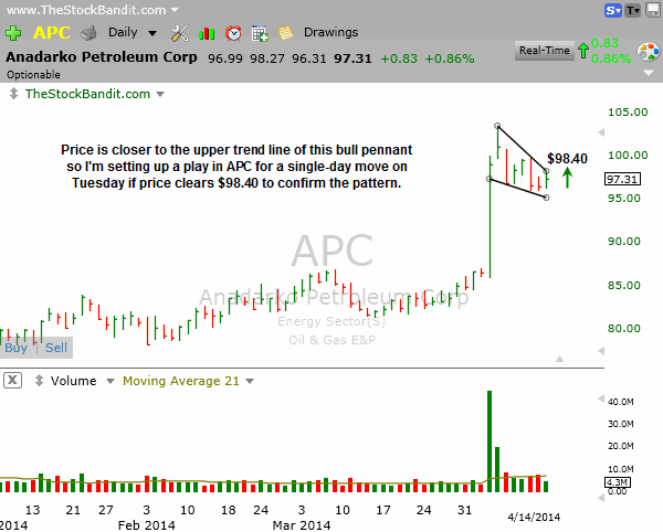 APC is turning higher within this bull pennant and an upside breakout at $98.40 would invite more short-term strength. I like this setup for a single-day play on the long side for a quick return to the high or beyond.