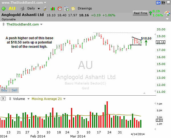 AU is basing here and a turn up through $18.50 would allow price to lift back toward the recent high, about $1 higher. I like this setup for a single-day play for Tuesday if it can clear the upper trend line.