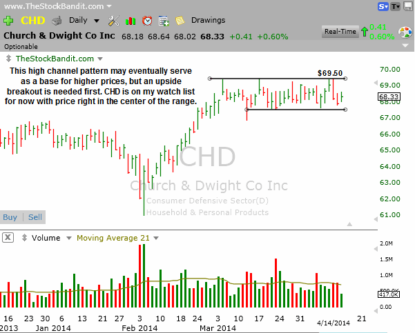 CHD is basing in a high channel pattern, holding up much better than the broad market has in recent weeks. This one may prove capable of breaking out to the upside, but for now I’m keeping it on watch as price sits in the center of the range. I prefer to see price pressuring resistance to suggest an imminent breakout, which isn’t taking place just yet.