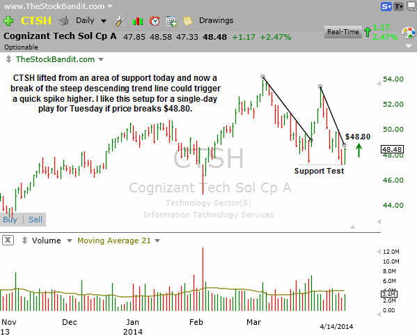 CTSH just bounced from support and now is facing a steep descending trend line. A turn up through the trend line at $48.80 could take on the appearance of a reversal and may invite some short-term momentum. I like it for a single-day play on the long side for Tuesday if price clears $48.80.