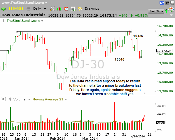 DJIA – The DJIA had broken down last week but not by much, so today it didn’t take much to get price back within the range. Volume was lacking on the bounce, but Friday’s decline was erased. Still 283 points to go before last week’s bounce high would be reached at 16456.