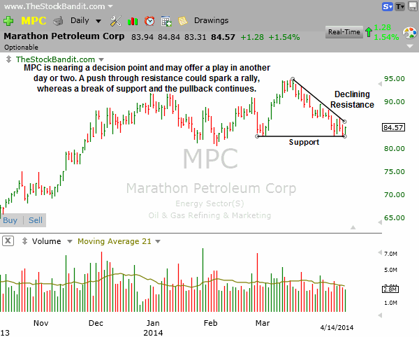 MPC is also on my radar as price gets squeezed between lateral support and declining resistance. An upside break and we could see price gain some traction, and a downside break and we could see the correction gather steam. For tonight, I’m holding off on a play and will wait to see if price gets nearer to one of these trend lines.