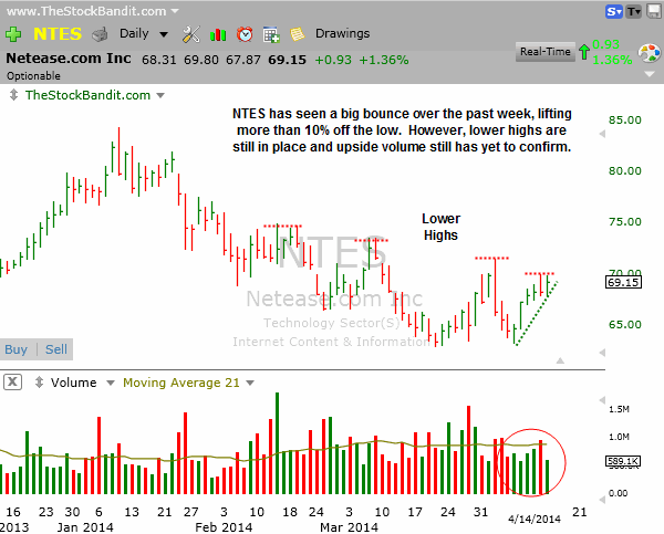NTES has just bounced big from the low of last week, tacking on over 10% from that level during the lift. However, volume isn’t confirming the bounce and we still have lower highs in place on an intermediate-term basis. Short-term momentum should not ever be ignored, but the big picture always should help to provide some guidance, so this doesn’t look like a chart to chase.
