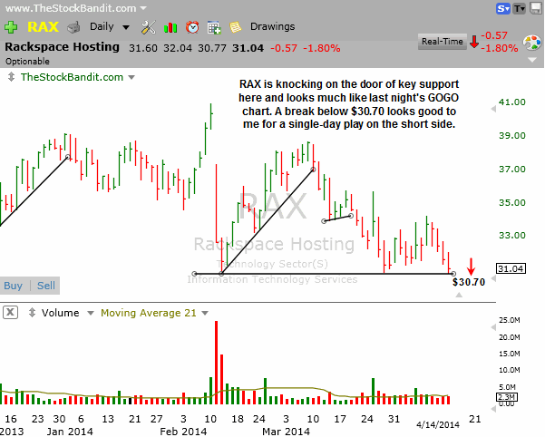 RAX is at key support tonight and a breakdown could spark a swift move lower. This chart is reminiscent of last night’s GOGO chart, which yielded an excellent trend move lower today of more than 8% (I hope you caught some). I like this one for a single-day play on the short side for Tuesday if price makes a new low at $30.70. That would allow me to participate in the initial breakdown move, but a swing stop is just not readily apparent on the daily chart so I’ll be out by the end of the day.