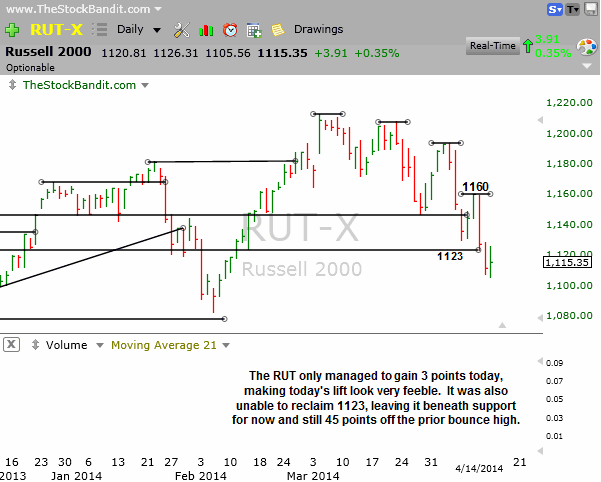 RUT – The RUT painted a green bar today, but it was minimal at only 3 points. This index is still 45 points off last week’s bounce high of 1160, and remains beneath the most recently-broken support level of 1123. The trend is still down and today’s small lift did not change that.