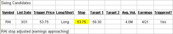 No new swing candidates tonight as charts still need time to set up cleaner patterns with more attractive risk/reward profiles for multi-day moves. RAI stop adjusted tonight to breakeven after a solid advance today. Due to earnings approaching, I will be out of RAI by the end of the week but will update again between now and then.