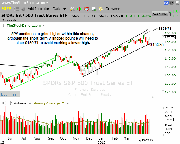 SPY – The S&P 500 ETF tested the lower boundary of its uptrend channel last week but has since lifted. It now stands about $2 shy of the all-time high of $159.71. Should this V-shaped rally happen to fizzle out beneath that level, it would result in at least a short-term lower high, so the next few days may prove critical for the bulls if they want to maintain the pace of this trend.