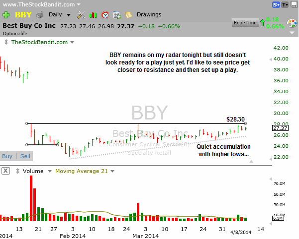 BBY is holding up well here and is still on my radar for a possible play in the days ahead. I’m waiting for price to lift a bit closer toward resistance before setting up a play, but I like the accumulation that has been underway in the last couple of months and a breakout could trigger an attempt for a partial gap fill.