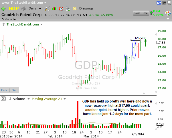 GDP has a recent history of 1-2 day lifts, so that’s all I’m looking for here. I like this one for a single-day play on the long side if it can make a new recovery high at $17.90. Next resistance is from February and stands about $0.90 away.