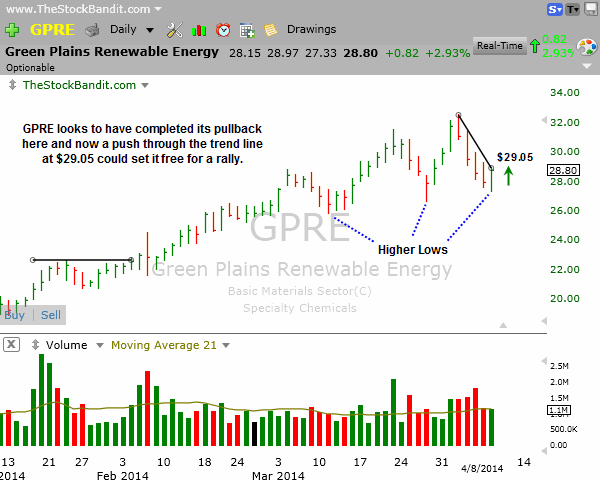 GPRE is carving out another higher low here and now a trend line break to the upside at $29.05 looks good to me for a single-day play on the long side. Here again, a swing stop would simply be too wide for my taste, as it would belong beneath today’s low, which would be more than 6% away. In a fickle market environment like we’re in, that’s more than I’m willing to give it.