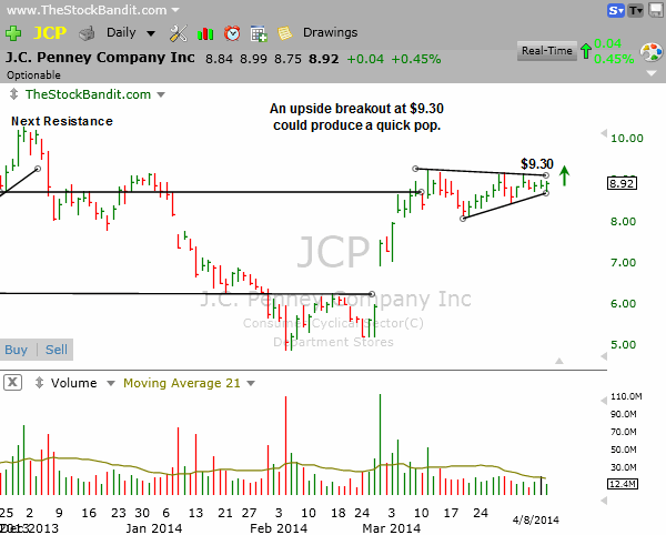 JCP is nearing the apex of this symmetrical triangle, but it could still tighten further. As of tonight, it’s just over 5% from the upper trend line down to the lower trend line, so I’m holding off on a swing entry. If price clears $9.30 on Wednesday, I’ll instead just go with a single-day play on the long side. Next resistance is about 10% higher, making a swing entry here only about a 2:1 in terms of reward to risk.