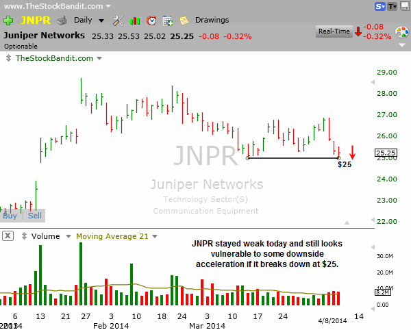 JNPR is still hovering above short-term support here so I’m again setting up a play on the short side for Wednesday. I’ll be interested in a single-day move to participate in the initial breakdown attempt if price undercuts $25. There’s an unfilled gap from January which could see a partial fill.