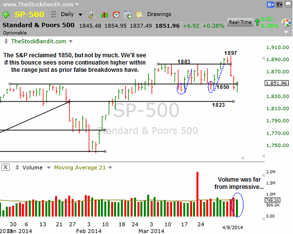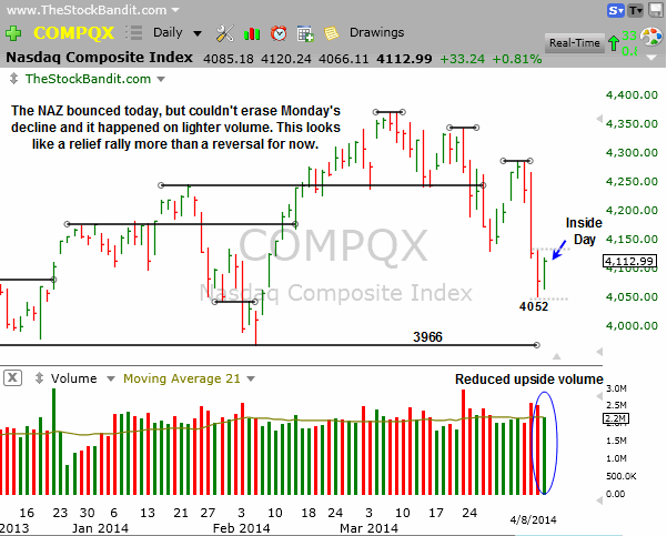NAZ – The NAZ painted an inside bar today as it respected Monday’s range. It also didn’t quite recover what was lost Monday, and upside volume was muted, so it’s difficult to expect long-lasting upside based on today’s bar. It’s an ever-changing picture, but with a downtrend already in place with lower highs and lower lows in recent weeks, bounces should be viewed as opportunities to raise cash. The longs I see at this point look best for quick-flip trades.
