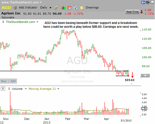 AGU may be ready to break down here after basing beneath broken support. A move below $89.60 sets up a momentum play on the short side, but with earnings due out next week there just isn’t much time to justify a swing trade.