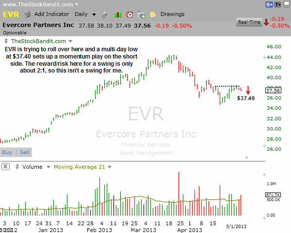 EVR is stalling out here after a bounce and could see a retreat back toward the April low soon. A swing stop would belong above this high, which makes the reward/risk about 2:1, so this is a momentum setup for me.