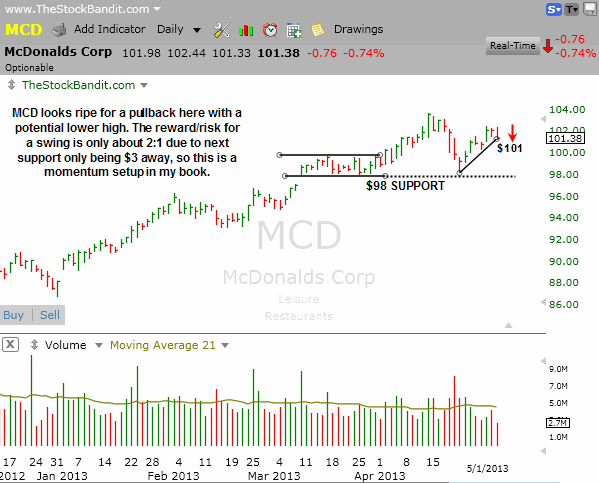 MCD is another one which essentially has a 2:1 reward/risk here as a swing stop would belong above the $102.60 area and key support comes in at $98 ($1.60 risk for $3 downside potential). I’m not satisfied with that for a swing, so I like it better for a momentum play here if price breaks rising support at $101.