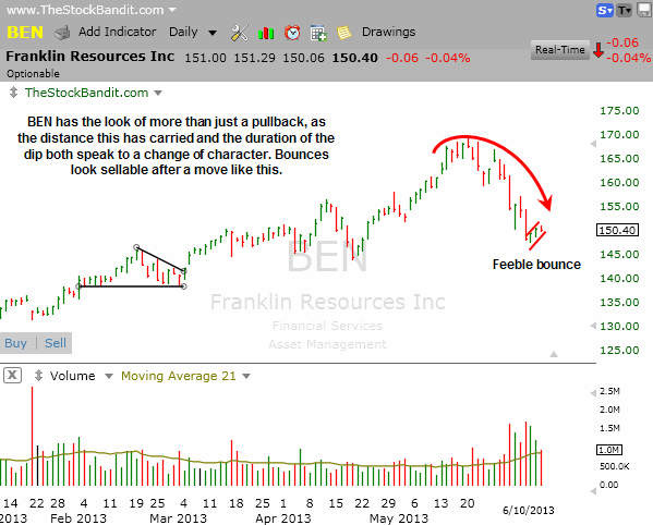 BEN is an example I wanted to show tonight of a stock that has changed character.  Previous pullbacks in recent months have been much more limited in their depth and duration, whereas this one has taken several weeks and has carried much deeper.  Pay close attention to the rhythm of stocks, because when it changes, it’s telling you something.