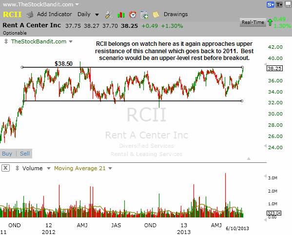 RCII is facing a possible breakout here from a trading range that has been intact since the fall of 2011!  The ideal scenario would be a pause up here before a breakout occurs, after which a measured move (height of the channel) could be expected.  A rest just shy of resistance would also help to establish a nearby stop.
