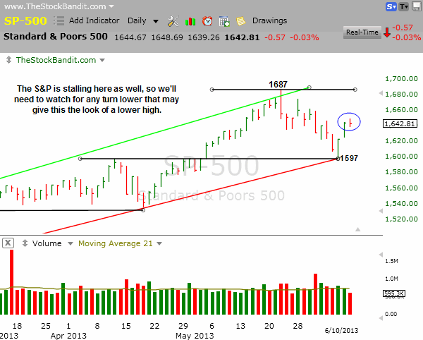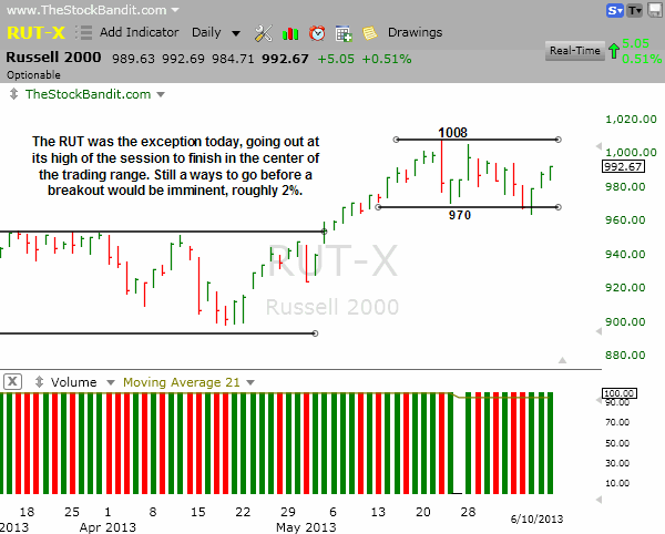 DJIA – The DJIA ended the day slightly in the red, and now sits right in the middle of its trading range.  After seeing this index fail at resistance a few weeks ago, it’s possible that this area evolves into a lower high, although more selling from here would need to occur almost right away.  Expect continued chop while this range persists.