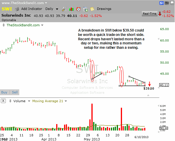 SWI is facing short-term support and a break below $39.50 could spark more selling pressure.  I like this for a momentum play given the brevity of the recent selloffs.