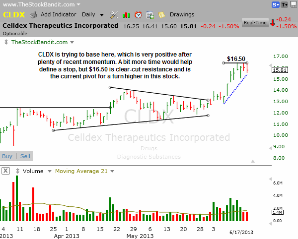 CLDX was due for a rest and now it’s getting one. Price is moving laterally but staying relatively close to upper resistance. I’m going to keep this one on watch for another day or two and see if rising support becomes a bit more clear while $16.50 resistance is further validated.