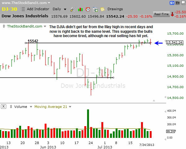 DJIA – The DJIA is back testing its breakout zone level as of tonight’s close, looking quite a bit like the S&P after a feeble breakout attempt through the May high of 15542. This index also acts like it could stand to rest a bit more before making another attempt higher, but we’ll see.