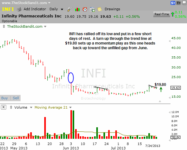 INFI has pulled back quietly the past couple of days and created a small trend line which could be used as a pivot for a turn back up. I like this setup for a momentum play above $19.80 for Thursday.