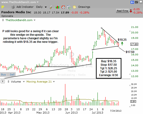 P is still the same setup I’ve been watching since Monday night when I listed it here, but my parameters have changed slightly so I’m relisting it. I’ll now use $18.35 as a buy point for a swing with a stop beneath today’s low. I would expect this wedge to get resolved one way or another before the end of this week, although I’m only interested in trading the long side if the upper trend line is cleared.