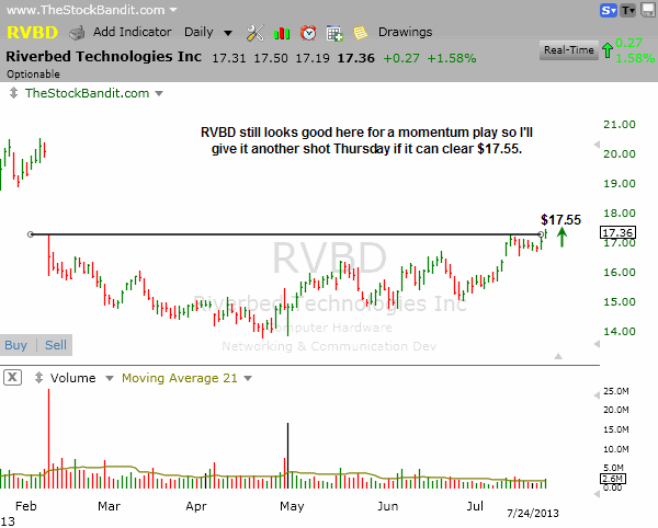 RVBD tried to make some headway today into the gap but the intraday market weakness likely prevented better progress. It still looks good, so I’ll set it up for a momentum play once more for Thursday above $17.55. Earnings are due out next week so this is not a swing candidate for me.